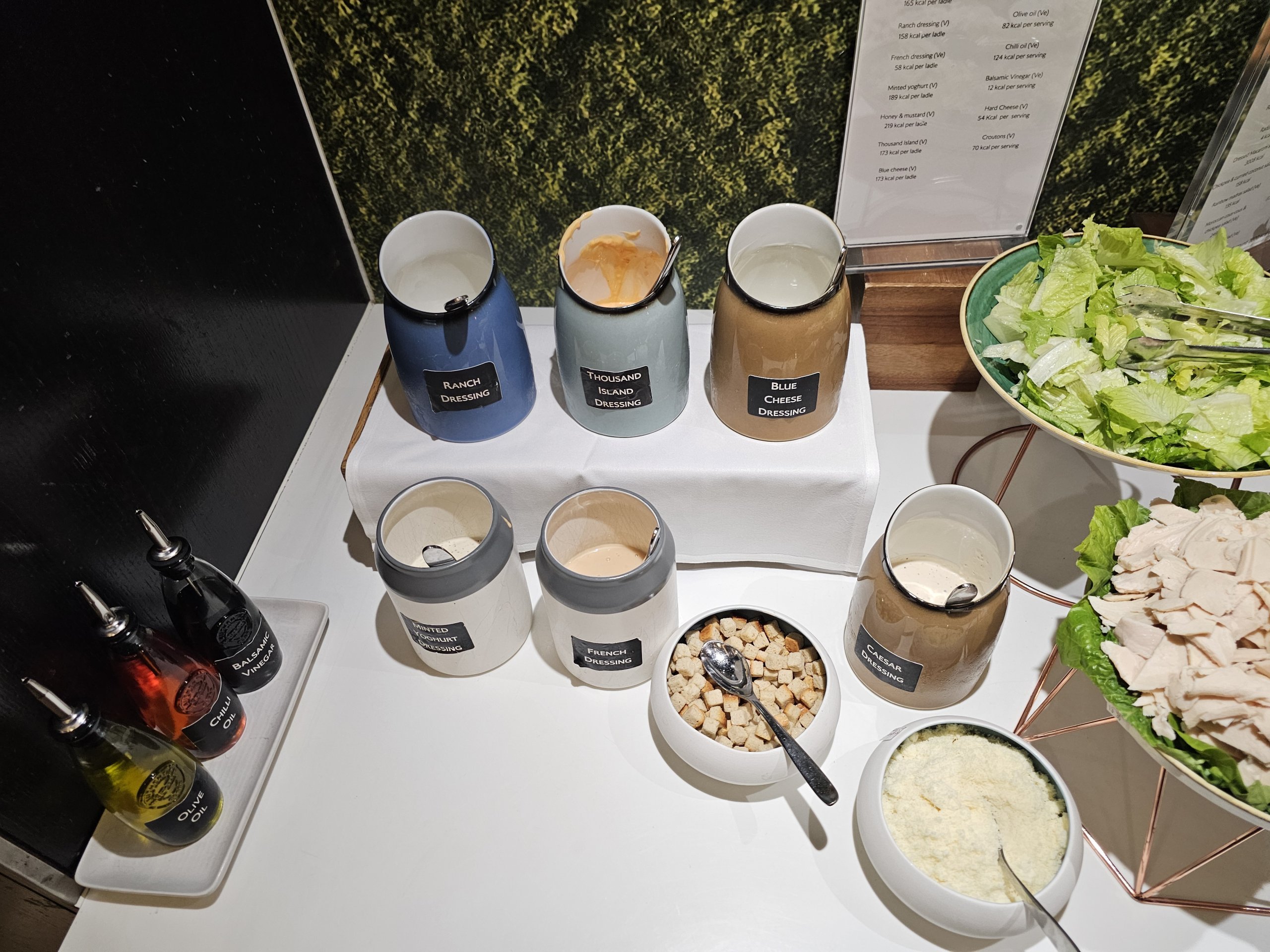 The cold food menu includes a few vegetables, a salad with a choice of different dressings and a very limited and weak selection of pastries (practically only sweet).