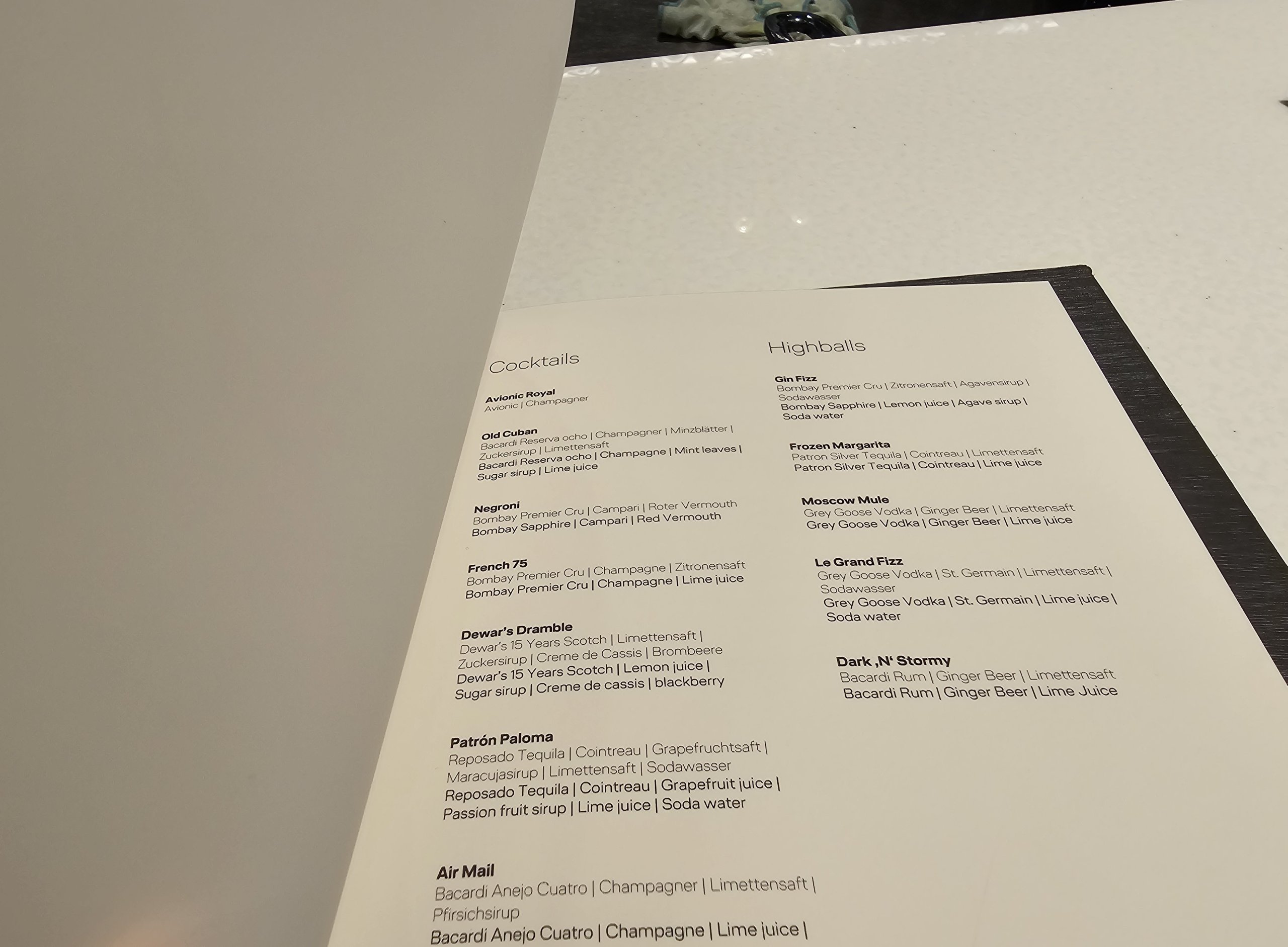 I skip the appetizer and have a beef steak for my main course, along with a classic - Lufthansa's signature cocktail called the Avionic.