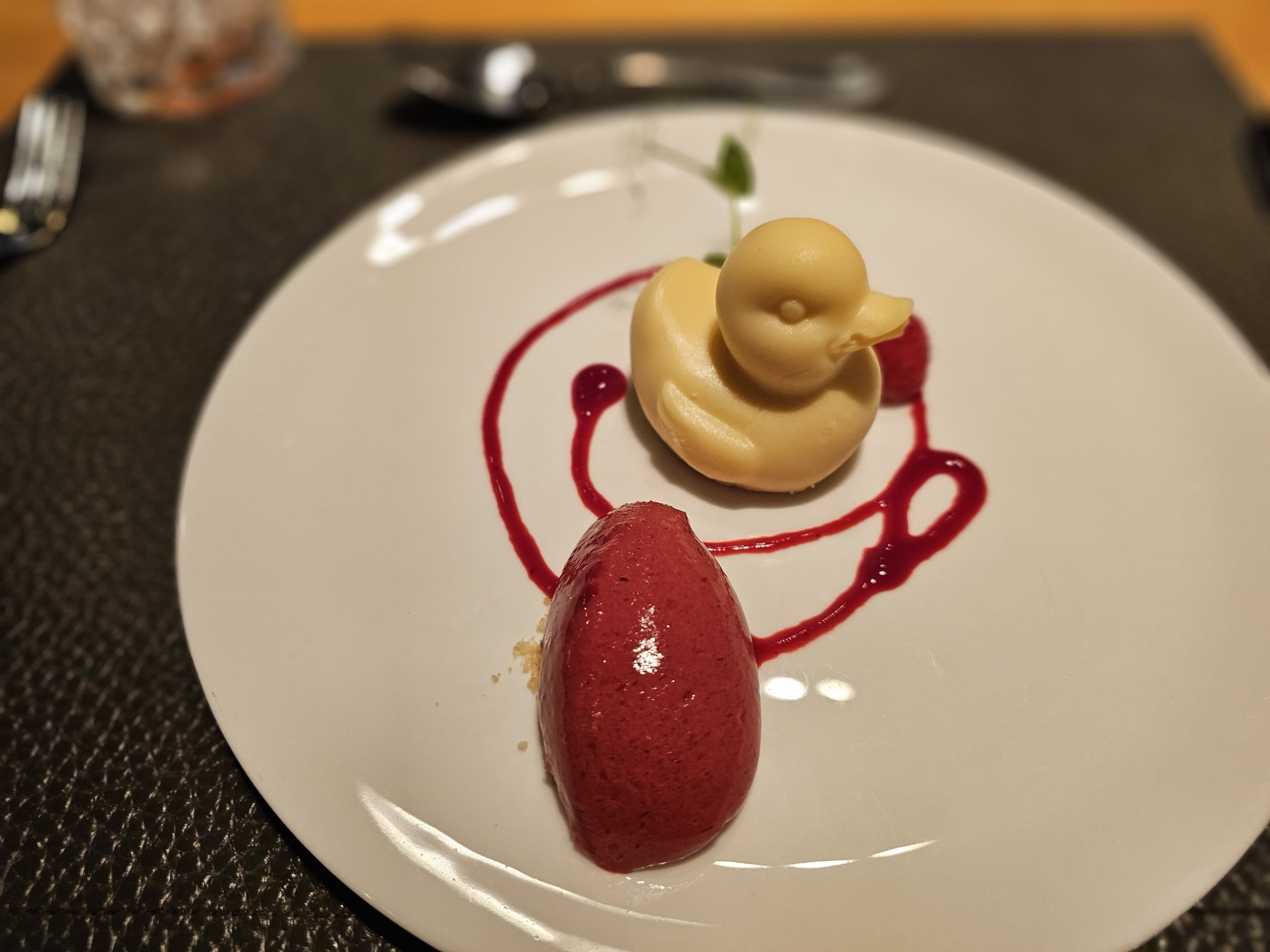 Dessert I can't choose other than the signature milk chocolate duck with raspberry ice cream. Now that I've started collecting the plastic duckies, which are different in every Lufthansa First Class lounge, I have to try the chocolate duck!
