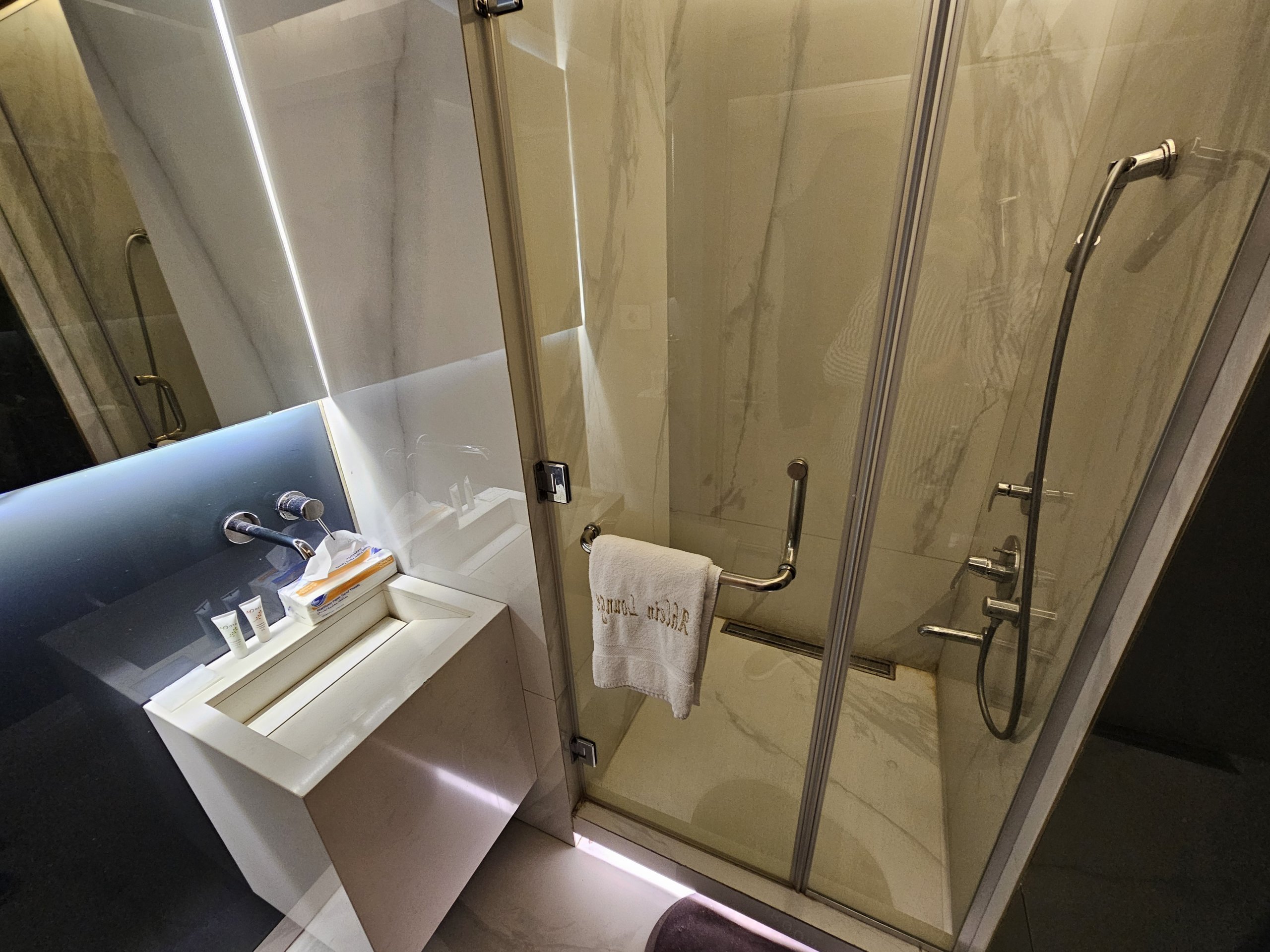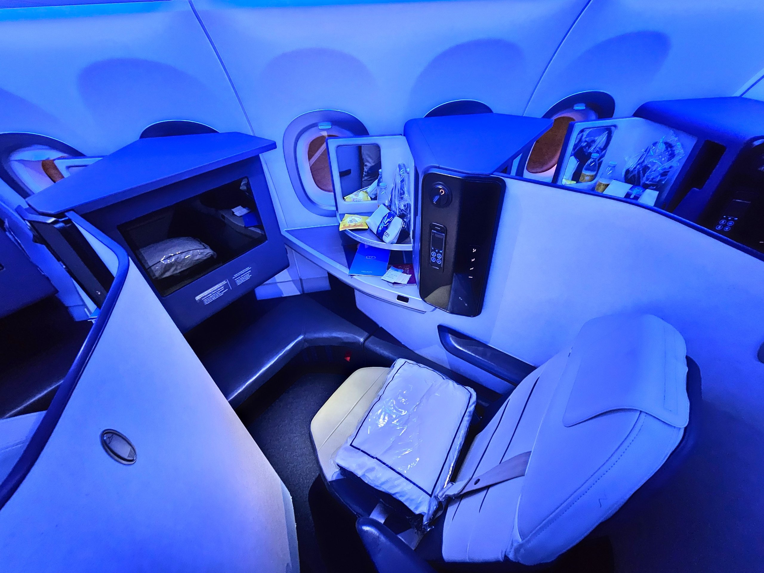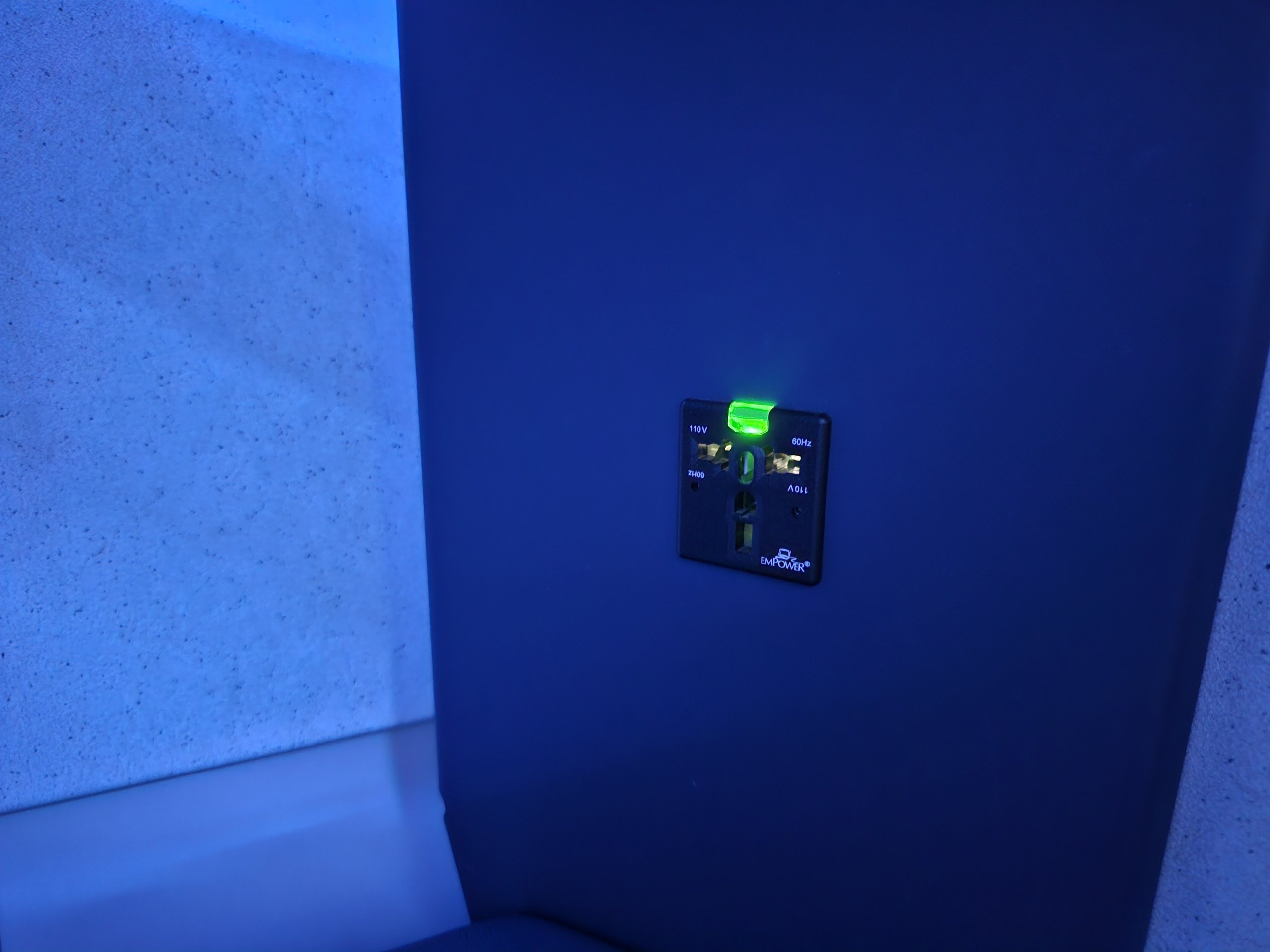 The elegant atmosphere is accentuated by the blue night lighting, as our flight departs at 4:35am.