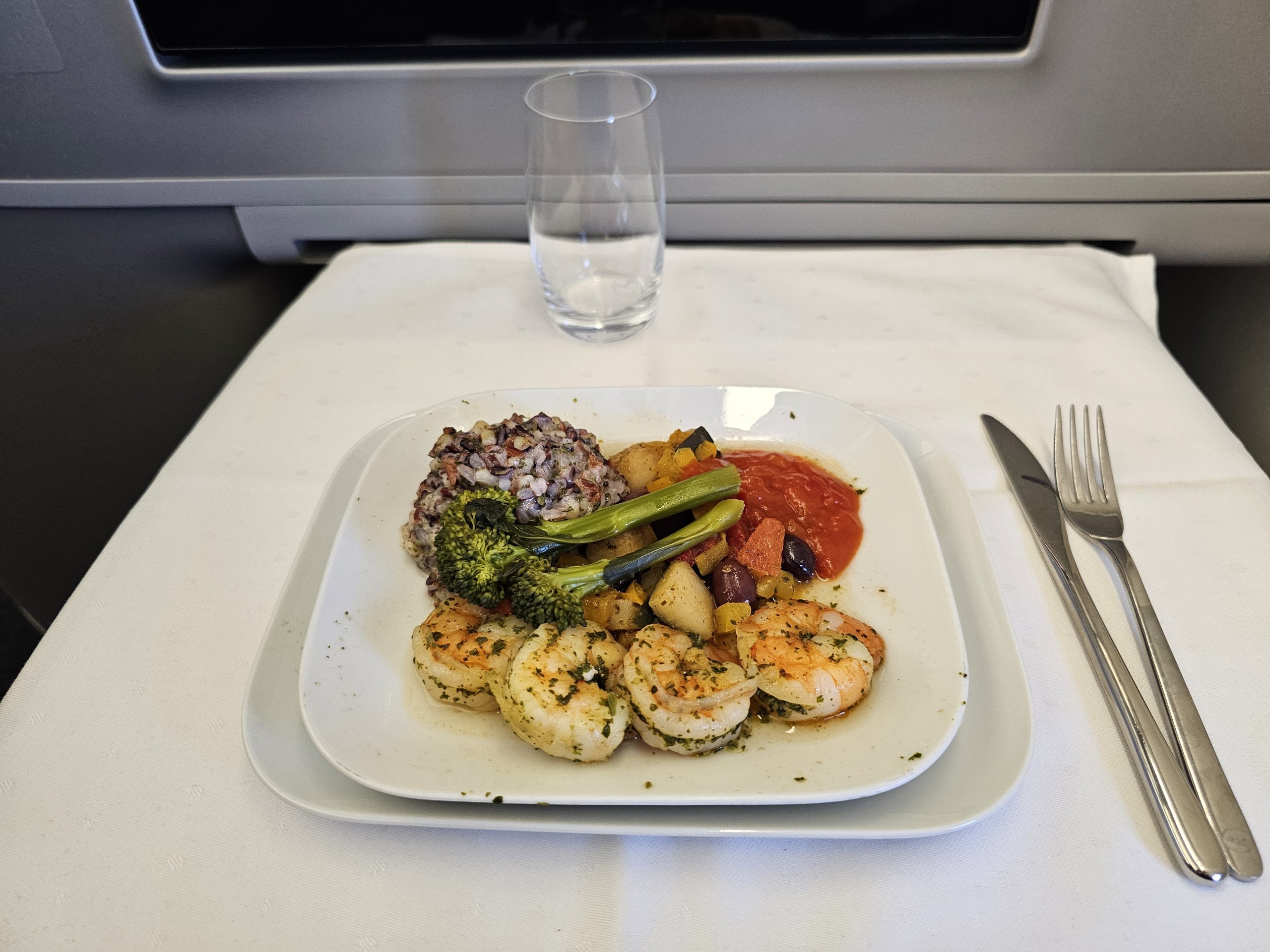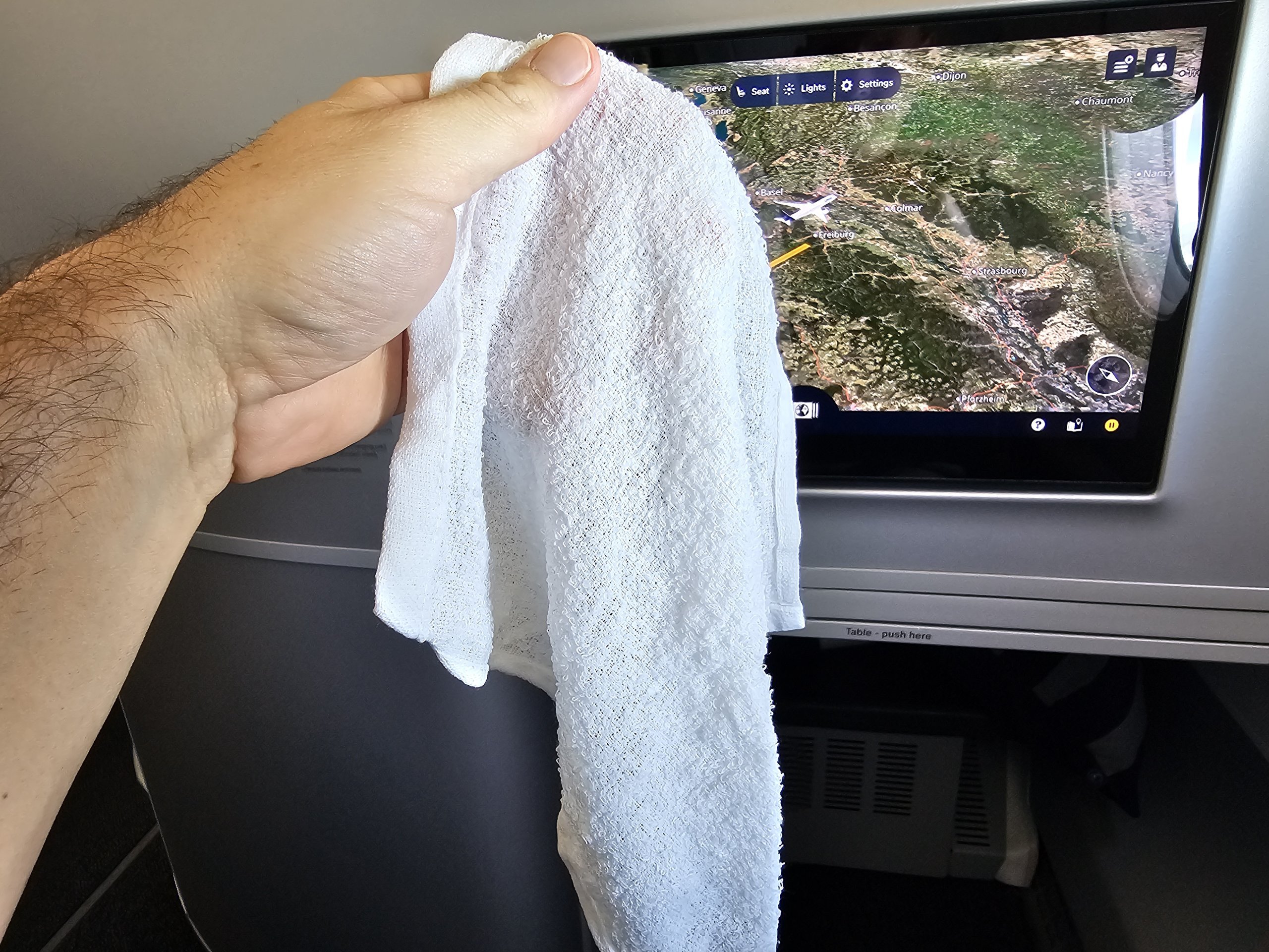 The main course arrives about an hour after takeoff. Before the meal, we get the traditional hot wet napkin, which is handed out once more before landing.