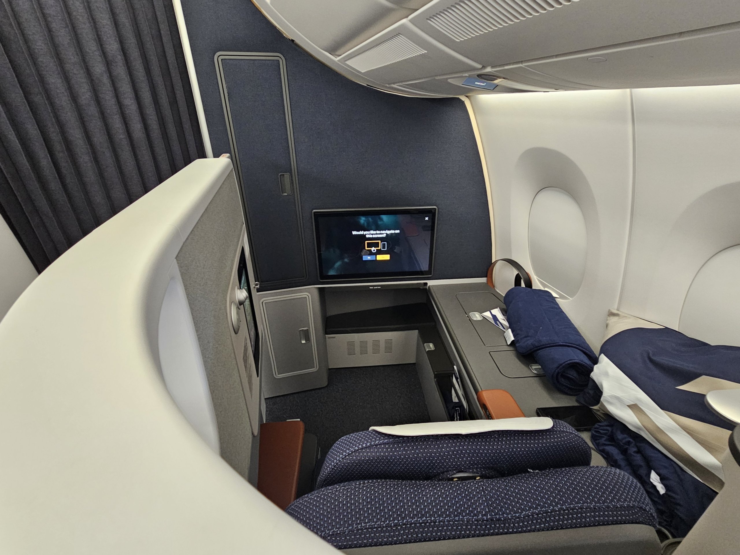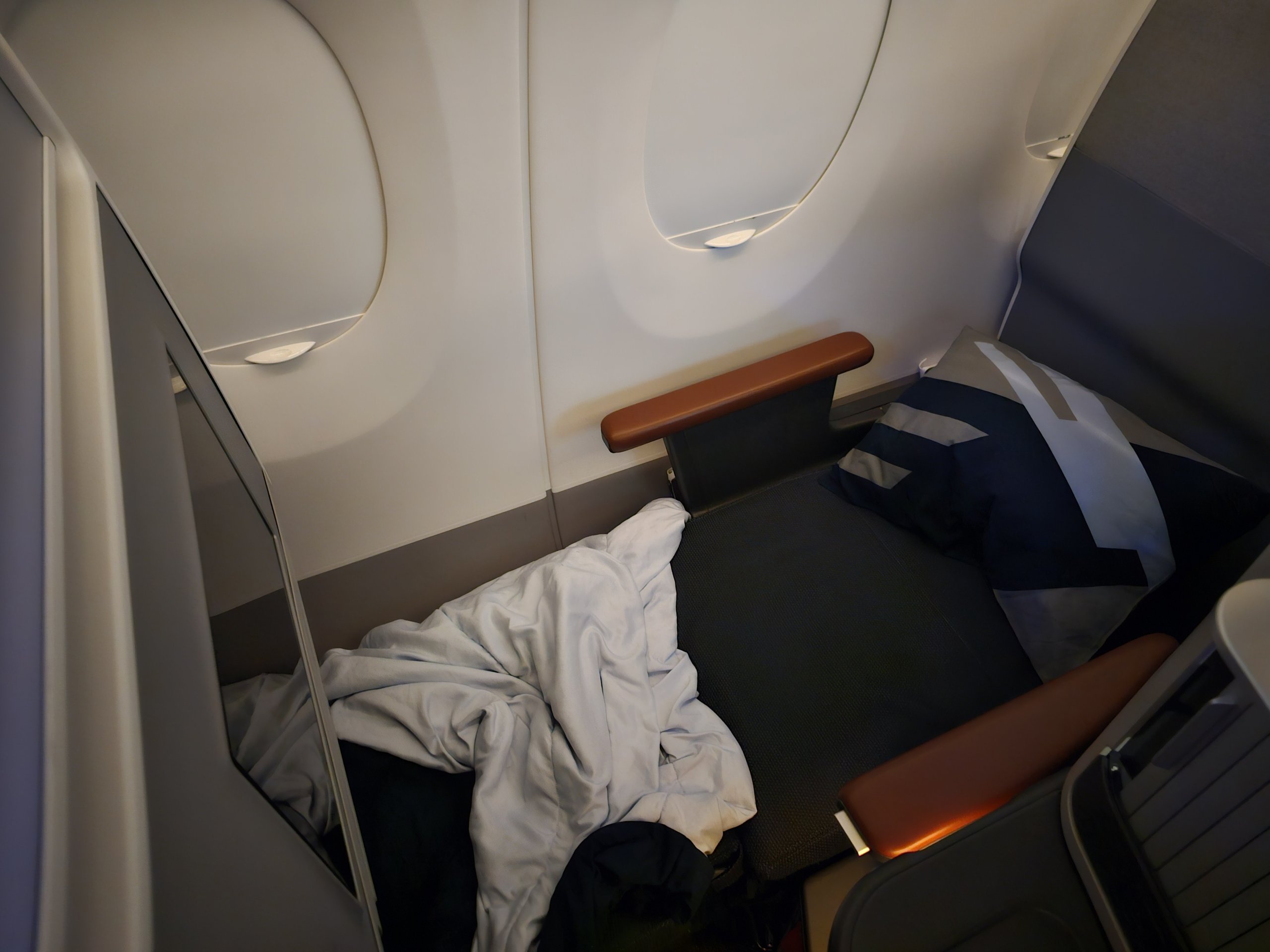 We're flying on an Airbus A350-900 that's only a few months old, and the business class cabin looks new and modern at first glance.