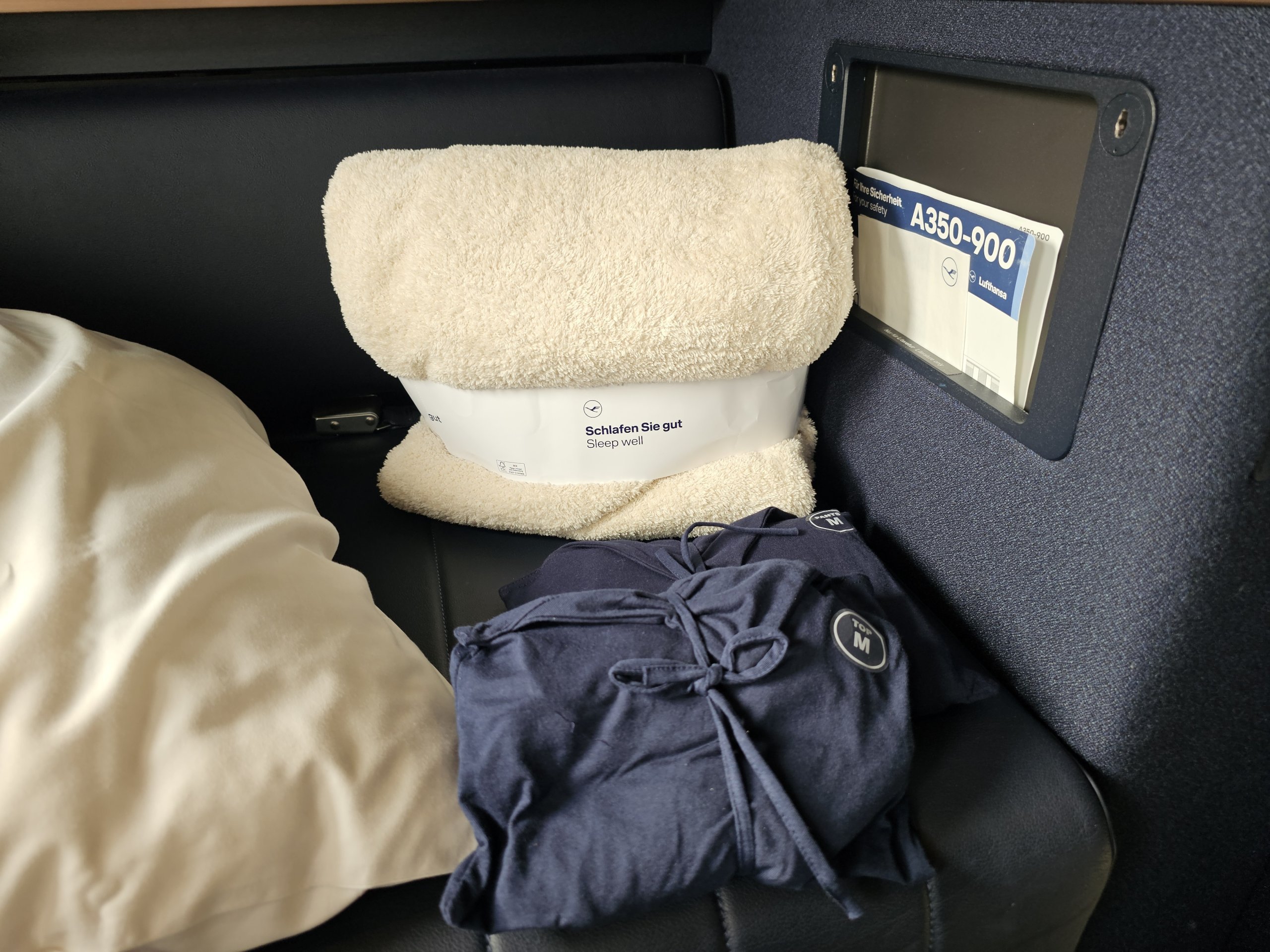 Shortly after take-off I still get a supply of pyjamas - 3 sizes are available: M, L and XL.