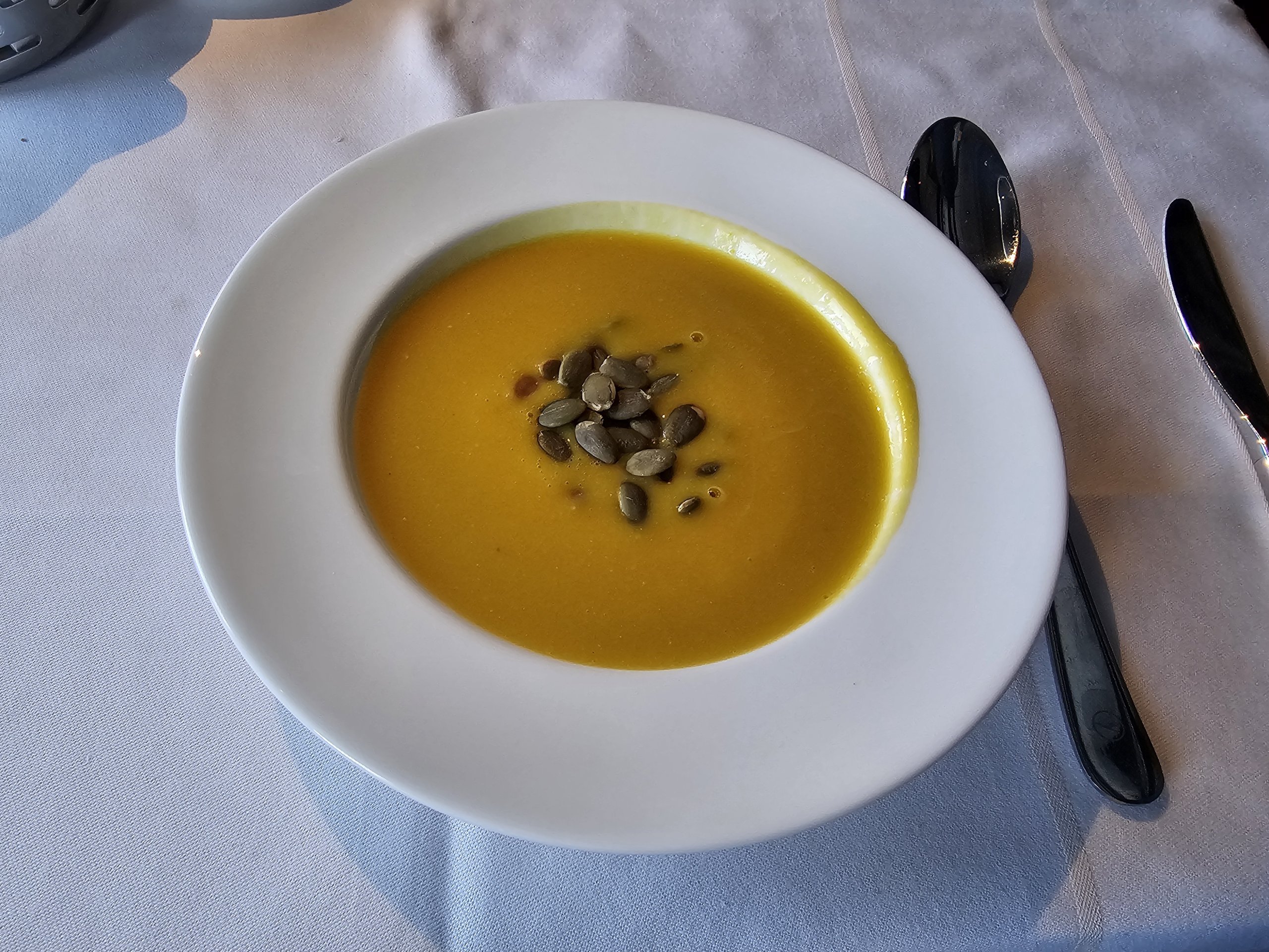 I have a great pumpkin and ginger soup before my meal.