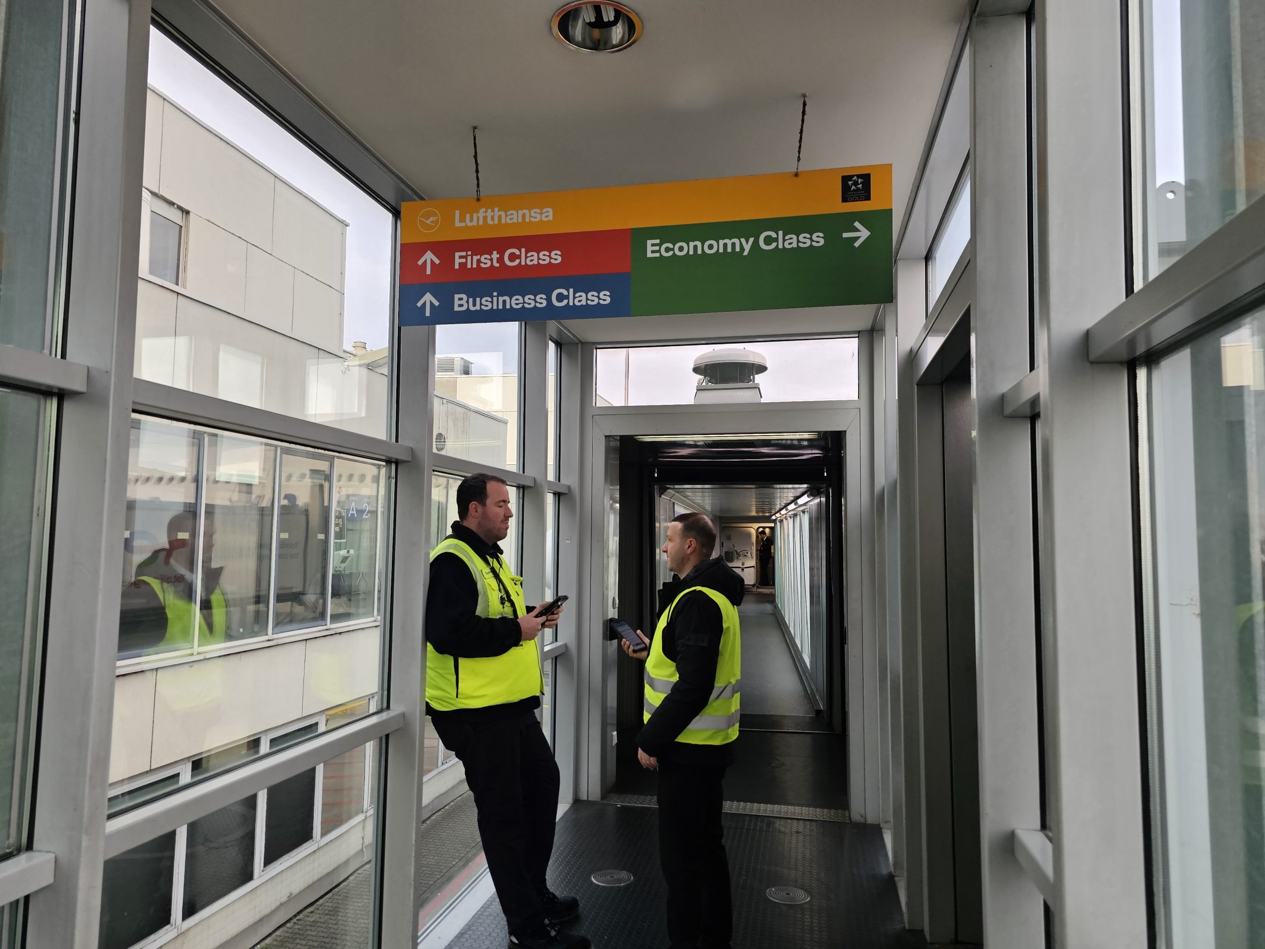 We exit the car on the tarmac, where we then go inside to the elevator that takes us to the standard boarding bridge.