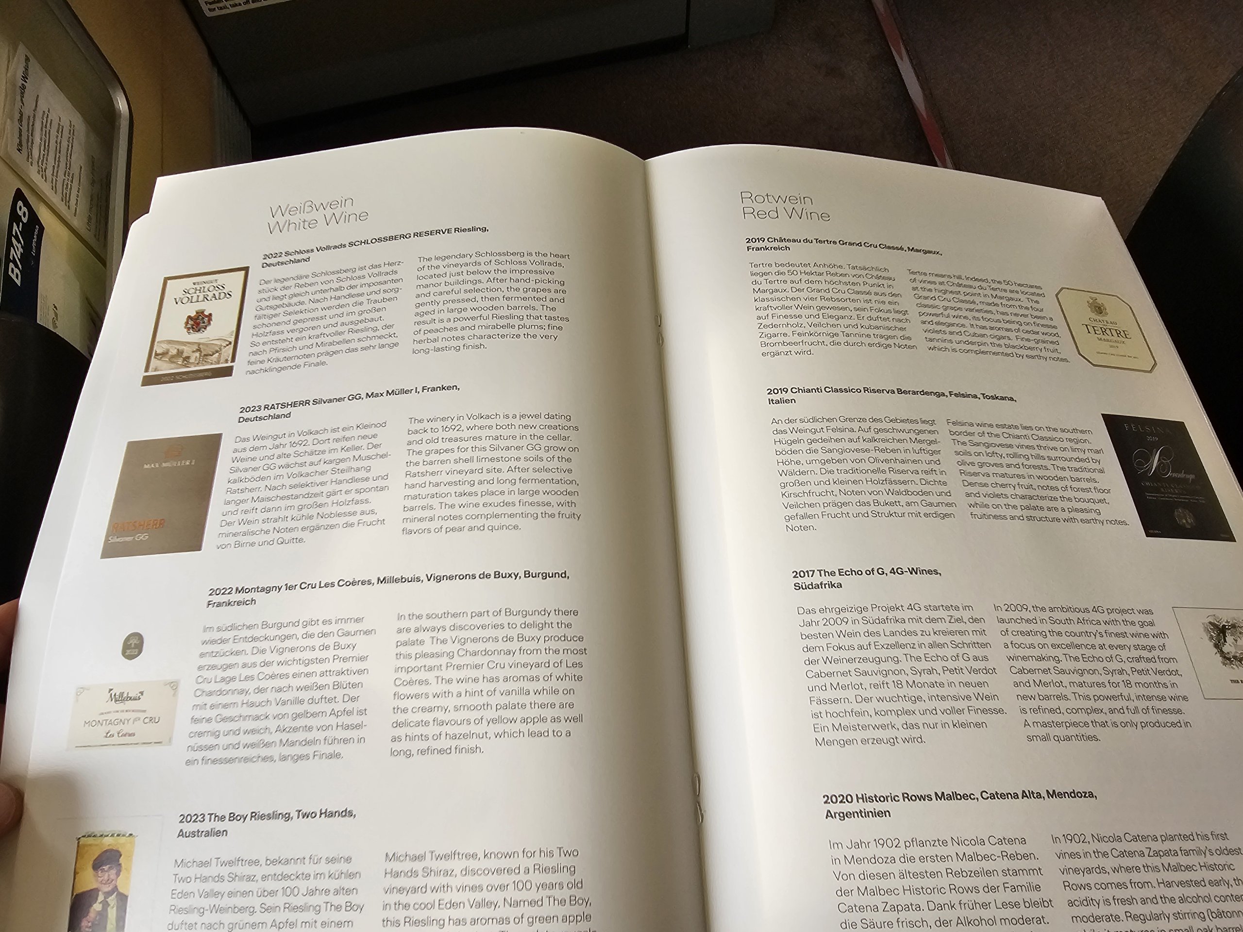 Before departure, all passengers receive a printed menu and a very comprehensive wine list.