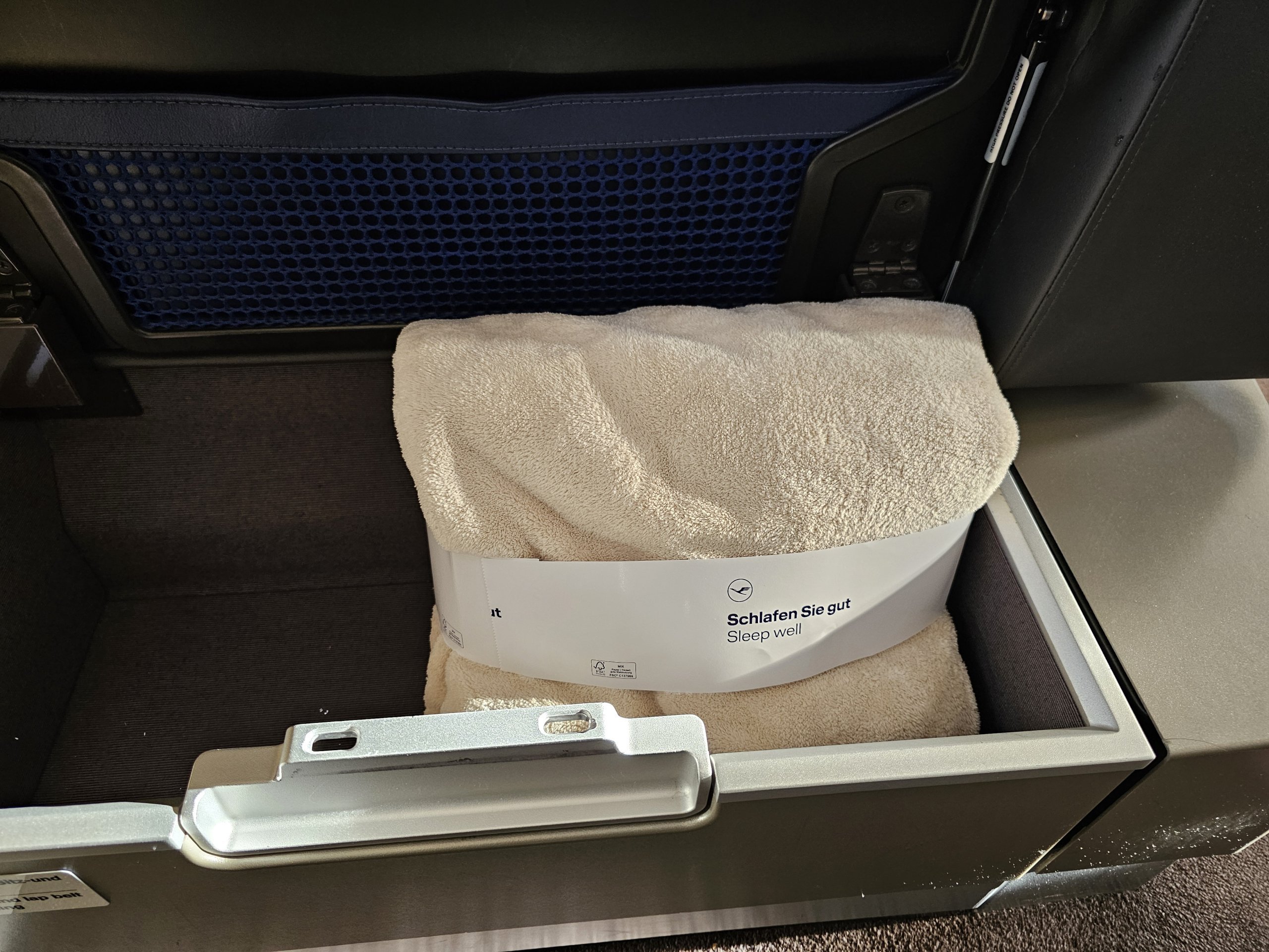 The seat is equipped with an extremely comfortable cushion and blanket that can be used at any time during the flight. For sleeping, you will then receive another blanket and bedding from the crew.