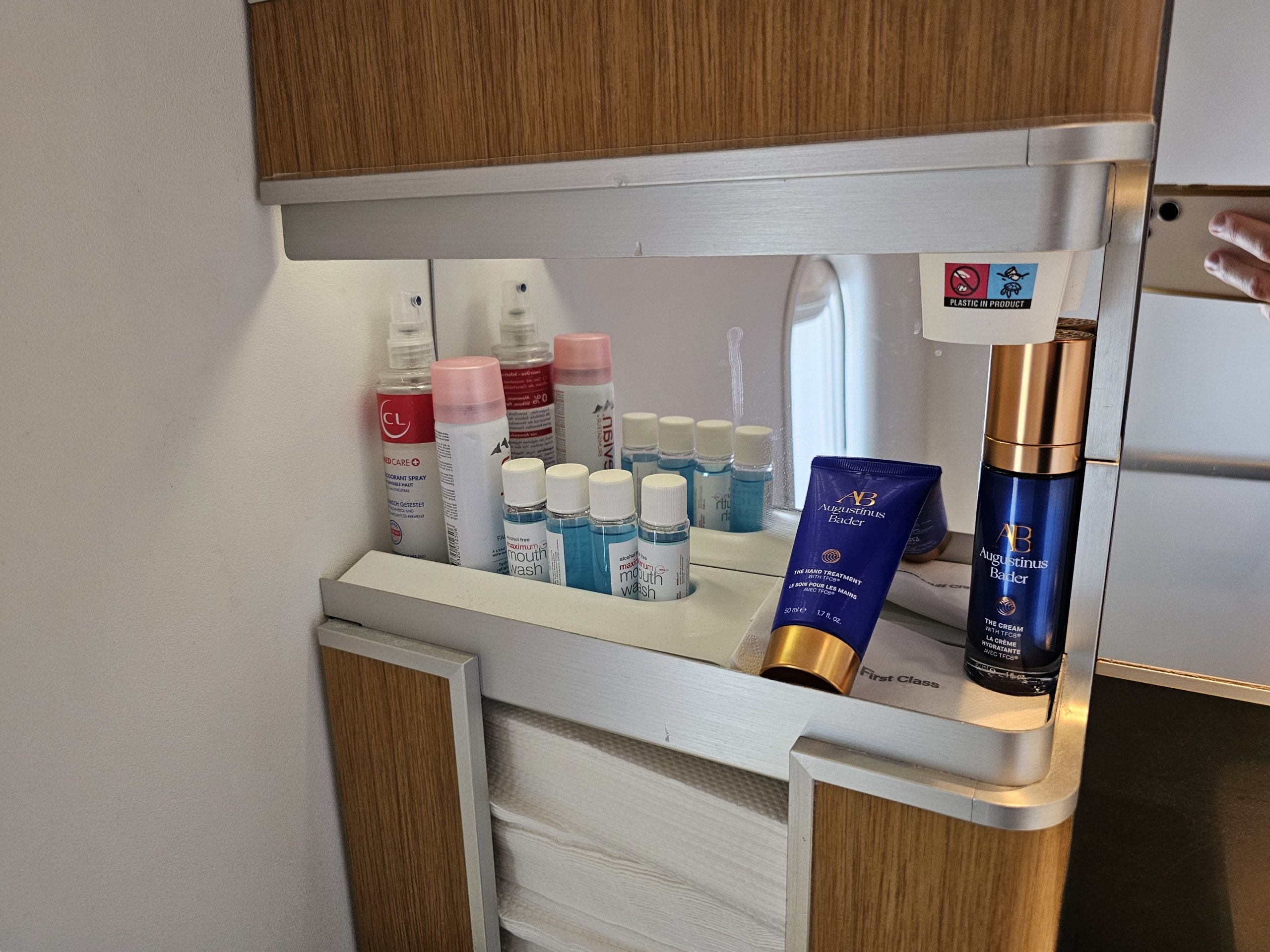 You can freely take bottles of mouthwash, wet wipes or hand creams in the first class-only lavatories.