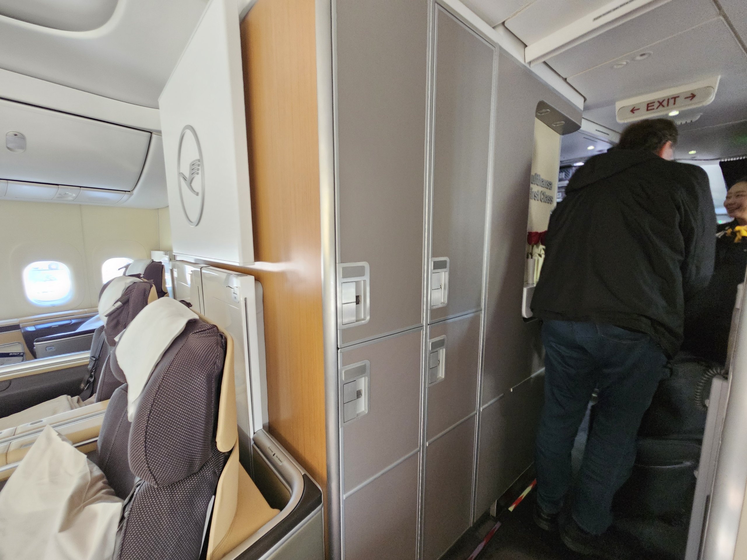 The Boeing 747-8 also has standard overhead bins in which I store my backpack. This is missing on the Airbus A350 in the new Allegris First Class, for example.