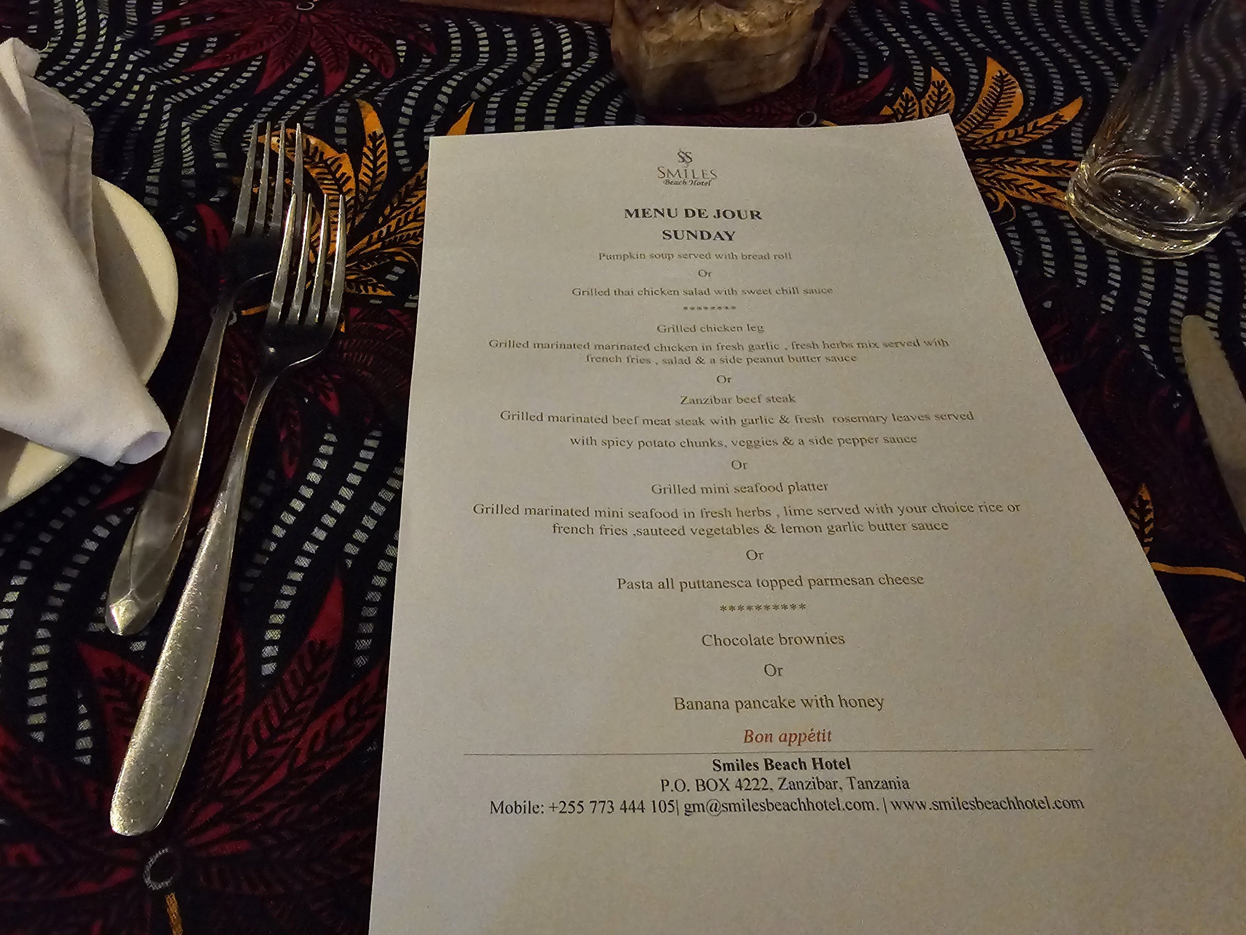 At first glance, the menu is very poor, but compared to other hotels in the same category on Zanzibar, such as Sea View Lodge in Jambiani, where I moved from Nungwi, it is actually above average.