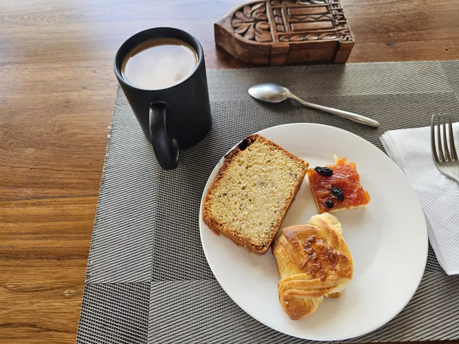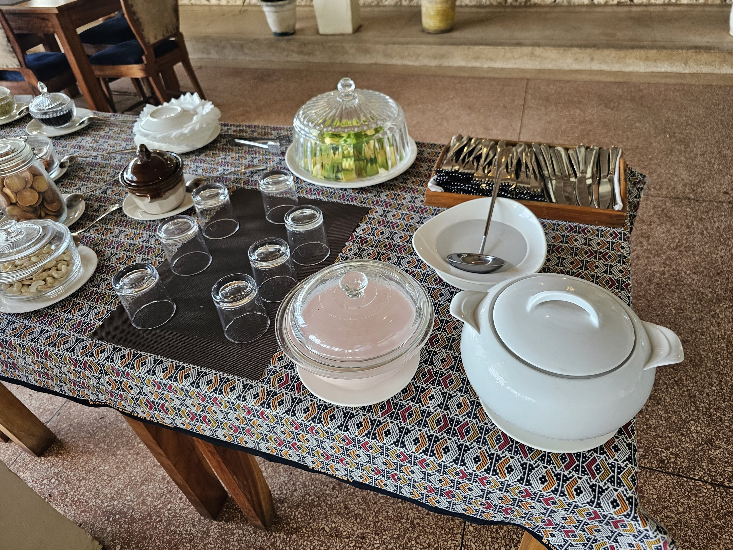 Other offerings include yoghurt, two to three types of fruit, sweet pastries, toasted bread and always two types of juice + water.