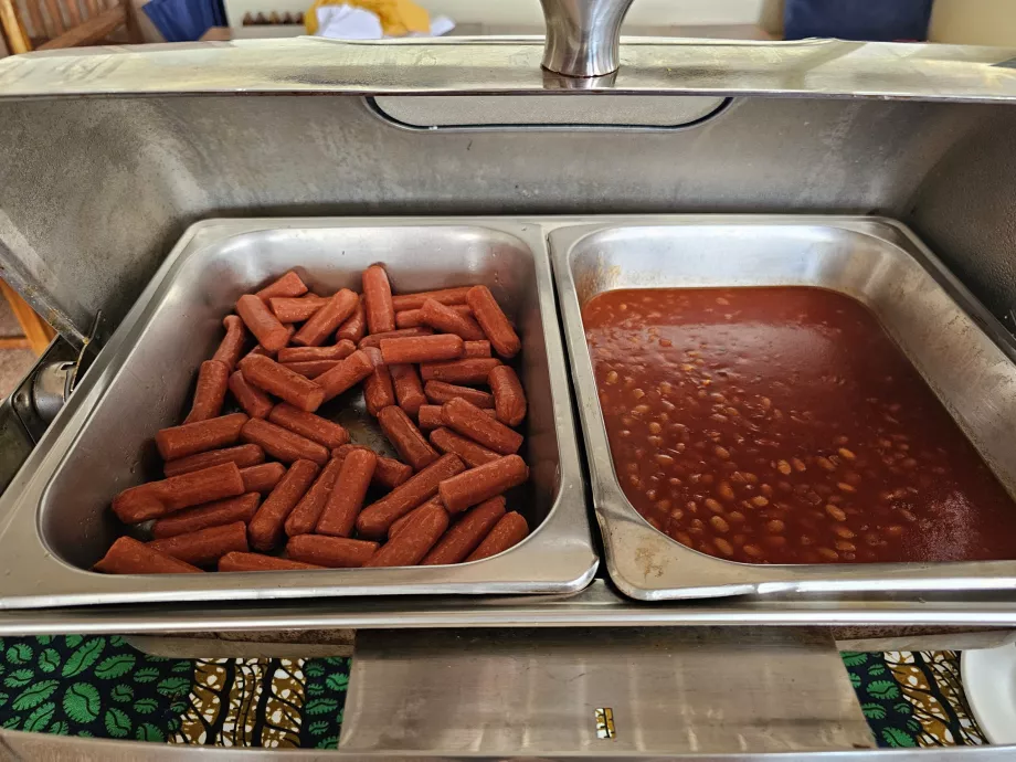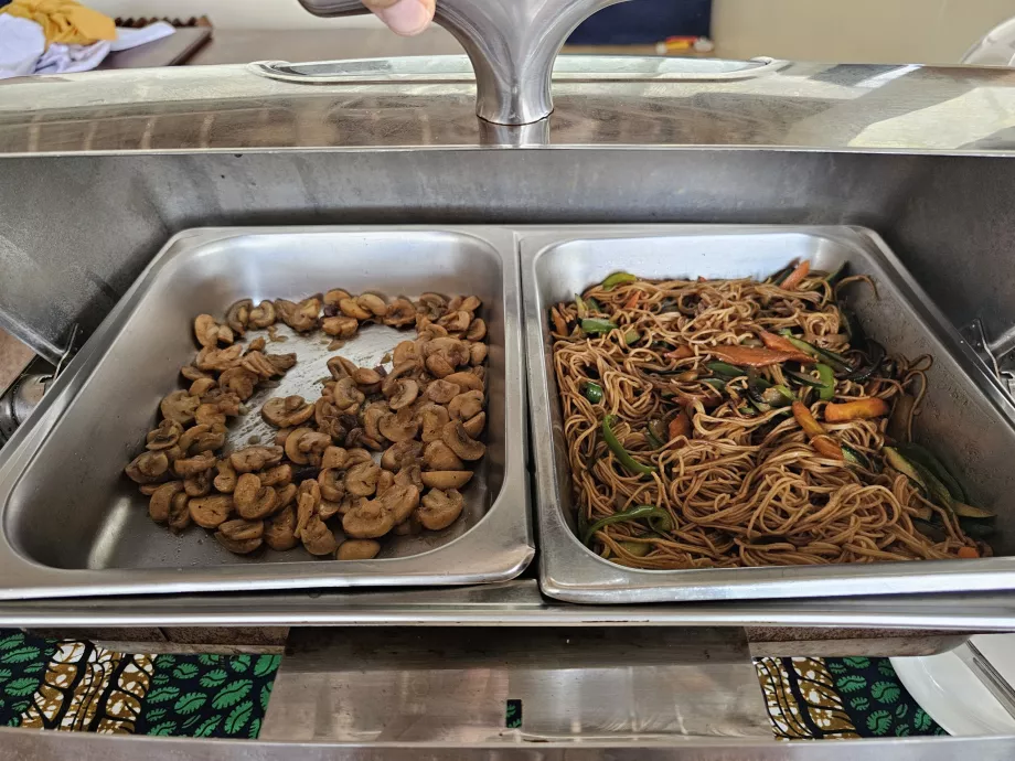 There are three types of hot food to choose from - mostly noodles or rice, very poor quality sausages, chapati pancakes or other local pastries, cooked vegetables, beans or mushrooms.