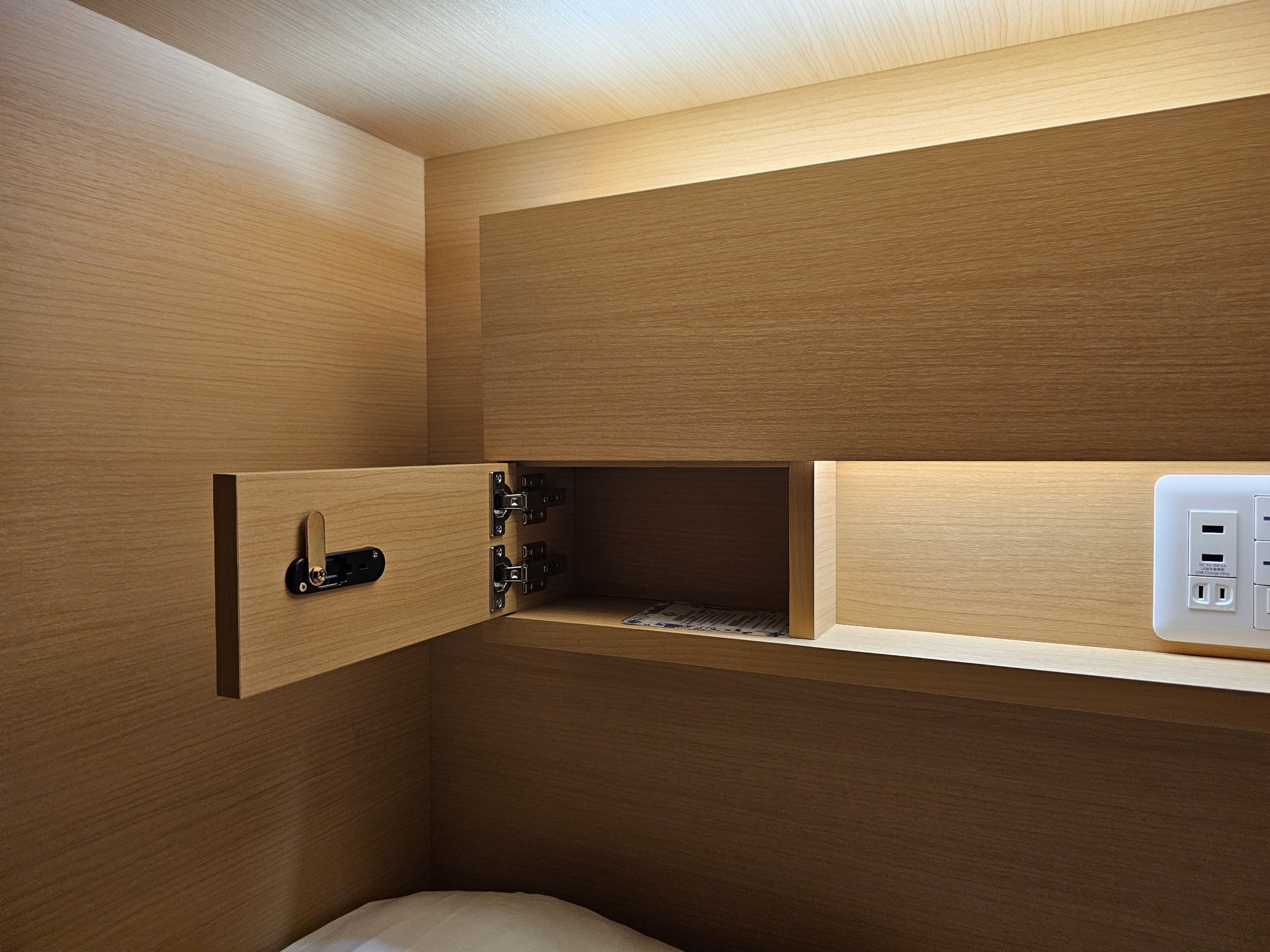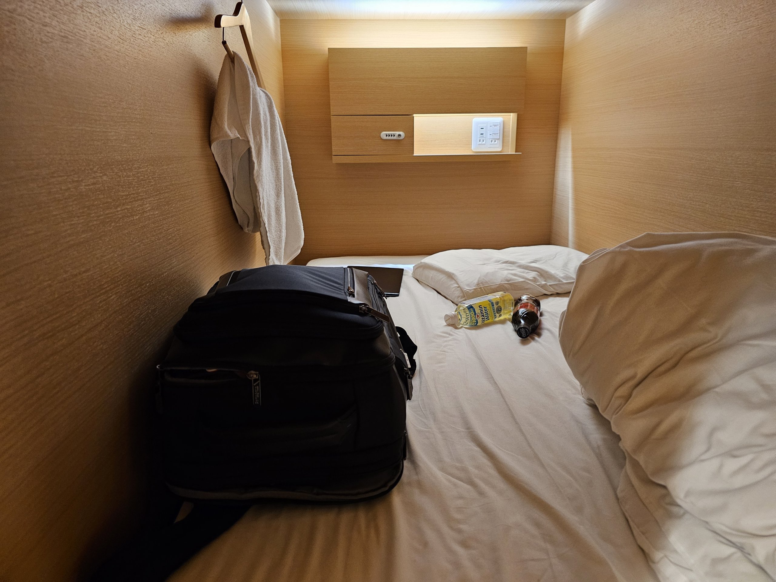 While there is no storage space in the capsule, because the mattress is relatively wide, I end up keeping my backpack and two drink bottles right by me.
